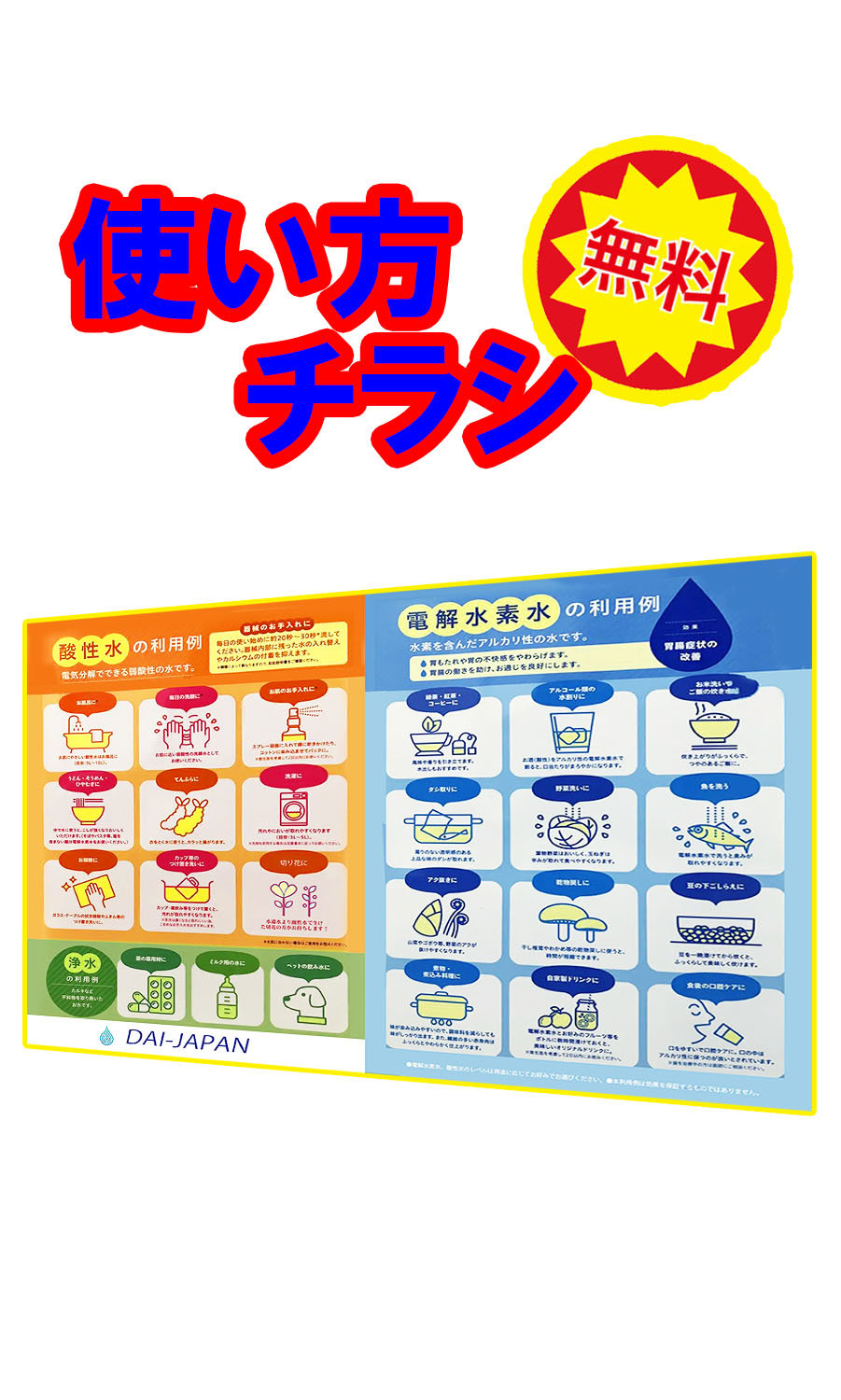 実はあなたも知らない電解水素水の活用方法があるかも!毎日飲用するお水だからこそ、料理での使い方、ご家族の皆さんの健康に活かせるコツをまとめたチラシをプレゼント!